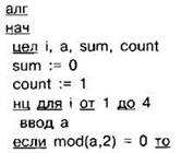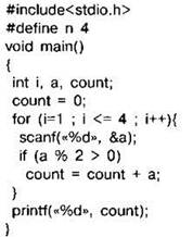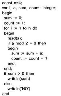 Задание 4.16.7. Требовалось написать программу, которая вводит с клавиатуры последовательность из n целых чисел (n=4), и выводит на экран сумму чётных чисел среди этой последовательности. Если в последовательности нет чётных чисел, программа выводит “NO”. Известно, что вводимые числа не превышают по модулю 1000. Программист торопился и написал программу неправильно.