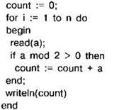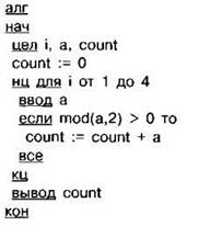 Задание 4.16.8. Требовалось написать программу, которая вводит с клавиатуры последовательность из n целых чисел (n=4), и выводит на экран количество нечётных чисел среди этой последовательности. Известно, что вводимые числа не превышают по модулю 1000. Программист торопился и написал программу неправильно.