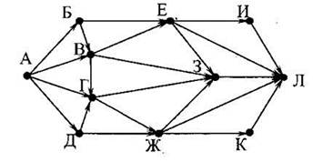 11. На рисунке - схема дорог, связывающих города А, Б, В, Г, Д, Е, Ж 3, И, К и Л. По каждой дороге можно двигаться только в одном направлении, указанном стрелкой. Сколько существует различных путей из города А в город Л?