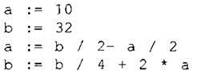 8. В программе “:=” обозначает оператор присваивания, знаки “+”, “-”, “*” и “/” - операции сложения, вычитания, умножения и деления. Правила выполнения операций и порядок действий соответствует правилам арифметики.