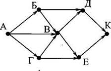 11. На рисунке - схема дорог, связывающих города А, Б, В, Г, Д, Е, К. По каждой дороге можно двигаться только в одном направлении, указанном стрелкой. Сколько существует различных путей из города А в город К?