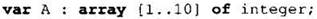 Здесь описан массив с именем А, состоящий из 10-ти элементов, пронумерованных числами от 1 до 10. В элементах массива хранятся целые числа. Обратите внимание, слова array(переводится как массив) и of (переводится как из) являются ключевыми словами языка программирования Паскаль.