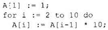 Немного другой способ похожего решения — использовать для вычисления очередного элемента значение предыдущего элемента массива. Значение первого элемента зададим перед циклом отдельно. Каждый последующий получаем, умножая значение предыдущего элемента на 10: