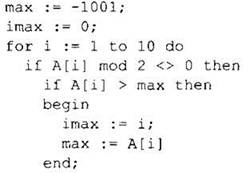 Найдём наименьший номер максимального нечётного элемента массива. Известно, что значения всех элементов массива лежат в диапазоне -1000...+1000.