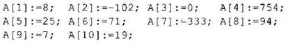 Допустим, требуется заполнить массив числами: 8, -102, 0, 754, 25, 71, 333, 94, 7, 19: