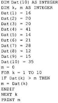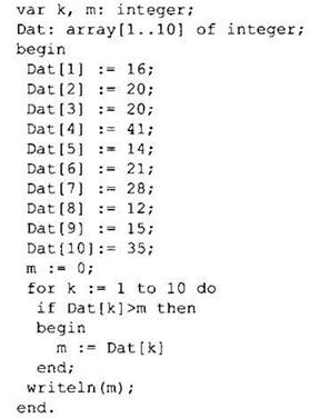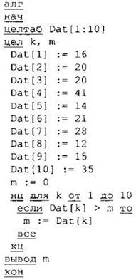 Анализируем предлагаемую программу и видим, что приведённый алгоритм совпадает с уже знаковым нам алгоритмом нахождения максимального элемента массива. Среди значений элементов массива находим наибольшее значение. Это 41.