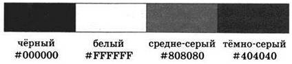 Таким образом, код чёрного цвета будет #000000, код белого цвета — #FFFFFF, код средне-серого цвета — #808080, а код тёмно-серого — #404040.