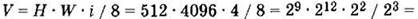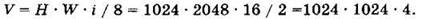 где V — объём неупакованного растрового изображения (в байтах), Н и W — ширина и высота растрового изображения (в пикселях), i — количество бит, которое тратится на один пиксель.