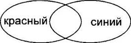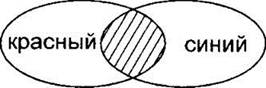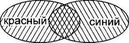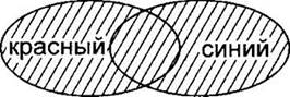 Теперь рассмотрим результат операции логическое ИЛИ на примере результата запроса “красный | синий”. Это те страницы, которые содержат или только слово “красный”, или только слово “синий”, или слова “красный” и “синий” одновременно. На диаграмме это та область, которая входит хотя бы в один нарисованный овал. Также заштрихуем область “красный” и область “синий”. Только теперь будем штриховать с наклоном в одну сторону (при операции логическое ИЛИ необходимо объединять области, поэтому можно выбрать одинаковую штриховку).