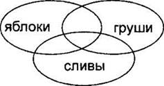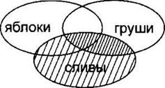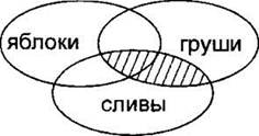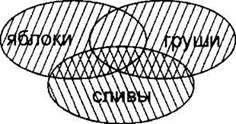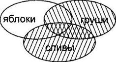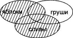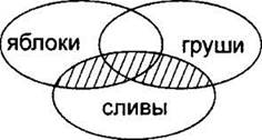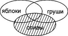 Как и ранее, строим сначала все три частично пересекающиеся области. Здесь тоже используются обе логические операции. Будем делать задание по действиям. Сначала строим выражение в скобках (“сливы & груши”). Закрасим левой и правой штриховками области “сливы” и “груши”.