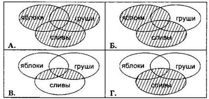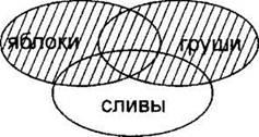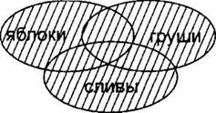 Построим те же частично пересекающиеся три овала, как сделали это в случае А. Только теперь заштрихуем только те области, которые нужны нам в запросе Б (“яблоки” и “сливы”).