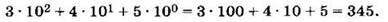 Теперь вспомним, что сотня — это 102, а десяток — это 101, а единицу представим как 10°. Получится, что наше число 34510 представимо как: