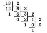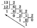 Рассмотрим перевод числа 13 в двоичную систему счисления. Так как хотим получить двоичное число, будем делить уголком нацело на 2.