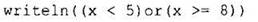 При проверке второго условия х должен оказаться либо в левой заштрихованной области, либо в правой. Чтобы х оказался в левой области, он должен быть строго меньше 5. Чтобы он оказался в правой заштрихованной области, х должен быть больше или равен 8. Нас устроит, чтобы из этих двух условий выполнилось хотя бы одно, поэтому объединим сравнения при помощи логической операции or: