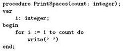 Вернёмся теперь к программе diamond из предыдущего параграфа и попробуем сделать её более понятной. Заметим для начала, что в программе несколько раз встречается цикл для печати заданного количества пробелов; вынесем это действие в процедуру. Поскольку процедура должна печатать любое количество пробелов, которое понадобится в программе, её придётся снабдить параметром; параметры подпрограмм в Паскале записываются в круглых скобках сразу после имени подпрограммы в виде списка, очень похожего на список описаний переменных. В нашем случае параметр будет всего один — количество пробелов, которое должно быть напечатано. Процедуру мы назовём PrintSpaces, а параметр — count; заголовок процедуры получится вот такой: