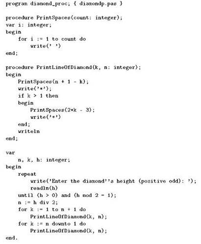 Прежде чем переписывать программу diamond, припомним замечание, сделанное сразу после её написания — о том, что тела двух циклов в этой программе оказались совершенно одинаковыми и что делать так нельзя, но справиться с проблемой невозможно без подпрограмм. Подпрограммы теперь в нашем распоряжении есть, так что заодно исправим этот недостаток. Вспомним, что тела обоих циклов у нас печатали очередную, k-ю строку фигуры “полувысотой” n и делали это так: сначала напечатать n + 1 — k пробелов, потом звёздочку, далее, если k > 1, то напечатать 2k — 3 пробела и ещё одну звёздочку, и в конце перевести строку. Как видим, для выполнения этих шагов нужно знать две величины: k и n; их мы передадим в процедуру через параметры, а саму процедуру назовём PrintLineOfDiamond. После замены тел циклов вызовами этой процедуры главная программа станет совсем короткой; вся программа целиком будет выглядеть так: