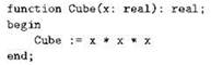 В отличие от процедуры, вызов функции представляет собой выражение, имеющее тип, совпадающий с указанным для функции типом возвращаемого значения. Для нашего примера, в частности, “Cube(2.7)” есть выражение типа real. Например, в нашей программе может встретиться что-нибудь вроде