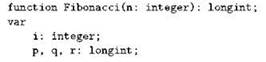 Как и процедура, функция является подпрограммой, то есть фактически представляет собой обособленный фрагмент кода, которому при вызове временно передаётся управление; в принципе, никто не запрещает ей выполнять совершенно произвольные действия. Значение, которое функция в итоге “вернёт” (то самое значение, ради вычисления которого её вызывают), задаётся в коде функции оператором присваивания специального вида, у которого в левой части вместо имени переменной записано имя самой функции. Наша функция Cube из одного этого оператора и состоит, но бывают случаи более сложные. Например, хорошо известна последовательность чисел Фибоначчи, в которой первые два элемента равны единицам, а каждый последующий равен сумме двух предыдущих: 1, 1, 2, 3, 5, 8, 13, 21, 34,... Функция, вычисляющая число Фибоначчи по его номеру, могла бы выглядеть, например, так (учитывая быстрый рост этих чисел, мы будем использовать для их нумерации числа типа integer, а для работы с самими числами Фибоначчи — числа типа longint):