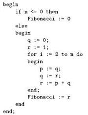 Здесь будут уместны некоторые пояснения. Основной алгоритм, реализованный в нашей функции, действует при условии, что номер, переданный в функцию через параметр n, не меньше единицы. На каждом шаге в переменных р, q и r хранятся два предыдущих числа Фибоначчи и текущее. Перед началом работы в q заносится 0, а в r — число 1, что соответствует числам Фибоначчи с номерами 0 и 1. Следует обратить внимание, что в переменной r теперь находится текущее число Фибоначчи, а номер текущего числа считается первым. Расположенный в последующих строках цикл “сдвигает” переменные р, q и r на одну позицию вдоль последовательности, для этого в р заносится то, что было в q (предпоследнее число становится предпредпоследним), в q заносится то, что было в r (последнее число становится предпоследним), а в r заносится сумма р и q, т. е. происходит вычисление очередного числа Фибоначчи. Иначе говоря, каждая итерация цикла увеличивает номер текущего числа на единицу, а само текущее число каждый раз оказывается в переменной r. Цикл выполняется столько раз, сколько нужно, чтобы номер текущего числа сравнялся со значением параметра n: если n равно единице, цикл не выполняется вообще, если двойке — цикл отрабатывает одну итерацию, и т. д. Полученное в итоге число г возвращается в качестве итогового значения функции.