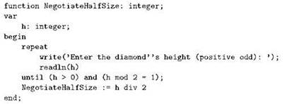 Например, в программе рисования “алмаза” из звёздочек мы могли бы ради дальнейшего упрощения главной части программы вынести в функцию организацию диалога с пользователем. Напомним, что нам в итоге нужно число п, представляющее собой полувысоту фигуры, но от пользователя требуется ввести высоту целиком, причём так, чтобы это было положительное нечётное число. Напишем функцию, которая проведёт весь диалог, а вернёт искомую полувысоту: