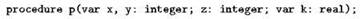 В заголовке подпрограммы перед описаниями параметров- переменных ставится слово var, которое действует до точки с запятой или закрывающей скобки; например, для процедуры с заголовком