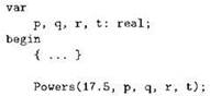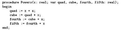 Процедура Powers имеет пять параметров; при её вызове в качестве первого параметра можно указать произвольное выражение типа real21, а вот остальные четыре параметра требуют указания переменной, притом переменной типа real и никакого иного. Это ограничение вполне понятно: внутри процедуры Powers идентификаторы quad, cube, fourth и fifth будут синонимами того, что мы укажем в точке вызова соответствующими параметрами, а работа с ними внутри процедуры ведётся как с переменными типа real; если попытаться в таком качестве использовать переменную любого другого типа (то есть использующую другое машинное представление для хранения значения), на выходе мы получим полный хаос.