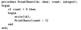 Как видим, для случая, когда печатать нечего, наша процедура ничего и не делает, а для всех остальных случаев она печатает один символ, так что остаётся напечатать на один символ меньше; для печати оставшихся символов процедура использует сама себя. Например, если сделать вызов PrintChars(*, 3), то процедура напечатает звёздочку и сделает вызов PrintChars(*, 2); “новая ипостась” процедуры напечатает звёздочку и вызовет PrintChars(*, 1), которая напечатает звёздочку и вызовет PrintChars(*, 0); этот последний вызов ничего делать не станет и завершится, предыдущий тоже завершится, и тот, что перед ним, тоже, и, наконец, завершится наш исходный вызов. Звёздочка, как легко видеть, будет напечатана трижды.