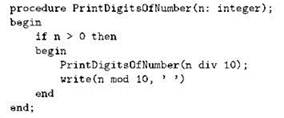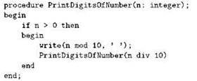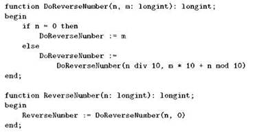 Рекурсивными бывают не только процедуры, но и функции. Например, в следующем примере функция ReverseNumber вычисляет число, полученное из исходного “переворотом задом наперёд” его десятичной записи, а сама рекурсия происходит во вспомогательной функции DoReverseNumber: