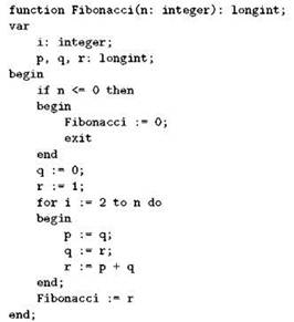 Чаще всего оказывается нужен оператор досрочного выхода из подпрограммы, который называется exit. Например, функцию вычисления чисел Фибоначчи, мы можем с использованием оператора exit переписать так: