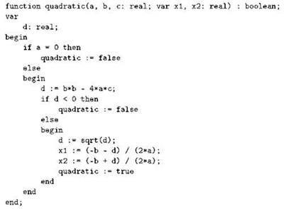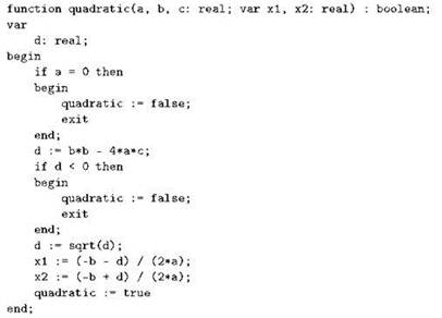 Выгода от использования оператора exit становится более очевидной с ростом количества специальных случаев. Пусть, к примеру, нам нужно написать подпрограмму, решающую квадратное уравнение. Коэффициенты уравнения она получит через параметры; поскольку вычислить (и вернуть) нужно два числа, а не одно, возврат лучше осуществить через параметры-переменные. Поскольку решение квадратного уравнения возможно не для любых коэффициентов, подпрограмму имеет смысл оформить в виде функции, возвращающей логическое значение: true она вернёт, если всё в порядке, ну а если по тем или иным причинам решить уравнение не получается, будет возвращаться значение false.
