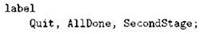 Метки должны быть перечислены в разделе описаний с помощью ключевого слова label, формирующего раздел описания меток; сами метки перечисляются через запятую, в конце ставится точка с запятой, например: