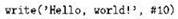 (в обоих этих случаях сначала выдаётся строка, а потом отдельно символ перевода строки); забегая вперёд, отметим, что можно сделать ещё хитрее, “загнав” символ перевода строки прямо в саму строку одним из следующих способов: