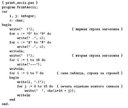 то будет корректным присваивание n := ord(c), при этом в переменную n будет занесён код символа, хранившегося в переменной с. Обратная операция — получение символа по заданному коду — производится встроенной функцией сhr; присваивание с := сhr(n) занесёт в переменную с символ, код которого (в виде обычного числа) находится в n — при условии, что это число находилось в диапазоне от 0 до 255; результат сhr для других значений аргумента не определён. Конечно, сhr(55) — это то же самое, что и #55, и 7; но, в отличие от литералов, функция сhrпозволяет нам сконструировать символ, код которого мы не знали во время написания программы или который во время работы программы меняется. Например, табличку, похожую на ту, что показана на рис. 2.3 (только без управляющих символов) можно напечатать с помощью следующей программы: