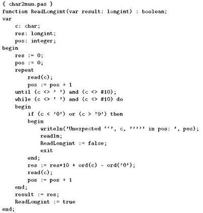 Осталось отметить, что для посимвольного чтения можно воспользоваться уже знакомым нам оператором read, указав параметром переменную типа char. Для большей универсальности пусть наша функция работает с числами типа longint. Итоговый текст будет выглядеть так: