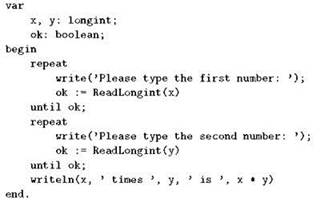 Для демонстрации работы с этой функцией напишем программу, которая будет запрашивать у пользователя два целых числа, считывать их с помощью ReadLongint и выдавать их произведение. Её главная часть может выглядеть, например, так: