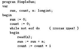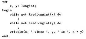 Эта программа примечательна тем, что тела обоих циклов пустые; роль пустого оператора выполняет символ точки с запятой, точнее, он завершает оператор цикла while, так и оставив его с пустым телом. Как можно догадаться, это стало возможным благодаря побочному эффекту функции ReadLongint; этот побочный эффект, состоящий в операциях ввода-вывода и в занесении значения в параметр-переменную, как раз и образует настоящее тело цикла.