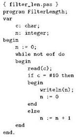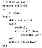 Умея выполнять посимвольное чтение и обнаруживать ситуацию “конец файла”, мы можем сами написать на Паскале программу-фильтр. Начнём с совсем простого фильтра, который читает текст из стандартного потока ввода и в ответ на каждую введённую пользователем строку выдаёт строку “Ок”, а когда текст кончится — фразу “Good bye”. Для создания этого фильтра нам совершенно не нужно хранить в памяти всю введённую строку, достаточно вводить символы один за другим, и когда введён символ перевода строки, выдавать “Ок”; делать это следует до тех пор, пока не возникнет ситуация “конец файла”. После выхода из цикла чтения останется только выдать “Good bye”. Пишем: