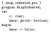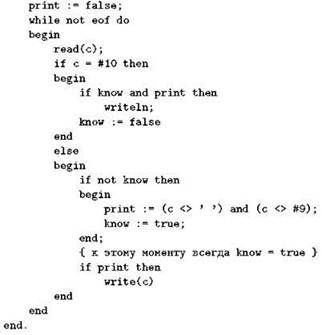 В начале программы нужно не забыть указать, что мы пока что не знаем, будет ли печататься следующая строка; это делается занесением “лжи” в переменную know. На всякий случаи занесём “ложь” также и в переменную print, иначе компилятор выдаст предупреждение о том, что эта переменная может быть использована без инициализации (здесь это не так, но для компилятора ситуация оказалась слишком сложной). Полностью текст программы будет выглядеть так:
