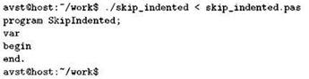 В самом деле, в нашей программе только эти четыре строки написаны с крайней левой позиции, а остальные сдвинуты вправо (используются структурные отступы) и начинаются, как следствие, с пробелов.
