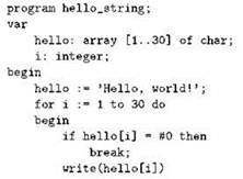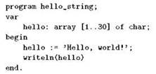 Поскольку строка — это последовательность символов, а символы можно представить с помощью значений типа char, логично предположить, что для обработки строк можно использовать массивы элементов типа char. Это действительно возможно; Паскаль даже допускает для таких массивов довольно странные действия, которые ни с какими иными массивами делать нельзя. Например, мы знаем, что массивы можно присваивать друг другу, только если они имеют строго один и тот же тип; но массиву, состоящему из сhаrов, Паскаль позволяет присвоить значение, заданное строковым литералом, то есть хорошо знакомой нам последовательностью символов, заключённой в апострофы: