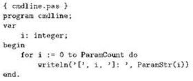 В программе на Паскале эти параметры доступны с помощью встроенных функций ParamCount и ParamStr; первая, не получая никаких параметров, возвращает целое число, соответствующее количеству параметров без учёта имени программы (в нашем примере это будет число 3); вторая функция принимает на вход целое число и возвращает строку (string), соответствующую параметру командной строки с заданным номером. При этом имя программы считается параметром номер 0 (то есть его можно узнать с помощью выражения ParamStr(0)), а остальные нумеруются с единицы до числа, возвращённого функцией ParamCount.