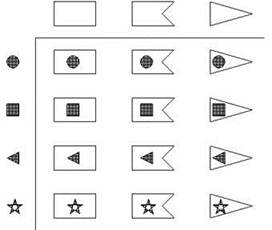 Эта задача тоже, можно сказать, стандартно-хрестоматийная, так что большинство людей, хотя бы приблизительно знающих, о чём идёт речь, просто перемножат два числа и получат совершенно правильный ответ — 12. Но гораздо интереснее здесь не то, как решить конкретную задачу, а то, какими вообще путями можно это сделать. Для начала отметим, что наше рассуждение с лампочками замечательно проходит и здесь: в самом деле, если бы у Оли были только заготовки прямоугольной формы, то она смогла бы сделать столько разных флажков, сколько у неё есть разных нашивок, то есть четыре. Если бы у неё были только заготовки треугольной формы, она бы тоже смогла сделать четыре разных флажка, и то же самое — если бы все её заготовки имели форму прямоугольника с вырезом. Но ведь первые четыре варианта отличаются от вторых четырёх вариантов, а третьи четыре варианта отличаются и от первых, и от вторых — формой заготовки; следовательно, всего вариантов 3 ∙ 4 = 12.