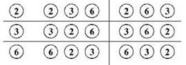 Эта задача отличается от предыдущей задачи про Колю и Васю тем, что шары в мешке, очевидно, перемешаются; иначе говоря, нас больше не интересует порядок следования элементов в итоговых комбинациях. Чтобы понять, как эта задача решается, представим себе, что Колю тоже заинтересовало, сколькими же способами он может выбрать три шара из имеющихся семи без учёта порядка, и он для начала выписал на листе бумаги все 210 вариантов, полученных при решении предыдущей задачи, где вместо мешка была полочка, то есть все возможные варианты размещений из семи по три с учётом порядка элементов. Зная, что варианты, различающиеся только порядком следования элементов, придётся теперь рассматривать как одинаковые, Коля решил для пробы посмотреть, сколько раз среди 210 выписанных комбинаций встречаются комбинации, состоящие из шаров с номерами 1, 2 и 3. Внимательно просмотрев свои записи, Коля обнаружил шесть таких комбинаций: 123, 132, 213, 231, 312 и 321. Решив проверить какой-нибудь другой набор шаров, Коля просмотрел свой список в поисках комбинаций, использующих шары с номерами 2, 3 и 6; таких комбинаций тоже нашлось шесть: 236, 263, 326, 362, 623 и 632 (эти комбинации уже знакомы нам по рис. 1.8).