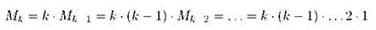 Если теперь добавить четвёртый шарик (пусть это будет шар с номером 5), мы получим четыре способа выбора крайнего левого из них, и при каждом таком способе остальные шарики можно будет расставить уже известными нам шестью способами; всего перестановок для четырёх шариков получится, соответственно, 24. Теперь мы, можно надеяться, готовы к обобщению: если для k — 1 шаров существует Мk-1 возможных перестановок, то, добавляя k-й шар, мы количество перестановок увеличим в к раз, то есть Мk = k ∙ Мk-1. В самом деле, при добавлении k-го шаравсего шаров становится как раз k, то есть самый первый (например, крайний левый) шар мы можем выбрать к способами, а остальные, согласно сделанному предположению, можно расставить (при фиксированном крайнем левом) Мk-1 способами. Поскольку начали мы с того, что для одного шара существует одна возможная перестановка, то есть М1 = 1, общее число перестановок для к шаров получится равным произведению всех натуральных чисел от 1 до k: