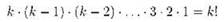 Как известно, это число называется факториаломk и обозначается “k!”; на самом деле определением факториала натурального числа k считается “число перестановок из k элементов”, а то, что факториал равен произведению чисел от 1 до k — это следствие.