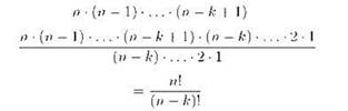 комбинаций (после того, как первые к шаров ссыпали в первый мешок и там перемешали, а остальные (n — k) шаров пока никуда не ссыпали), но среди этих комбинаций каждые (n — k)! потом тоже стали неразличимы из-за перемешивания шаров во втором мешке. Итого n! превосходит искомое Сnk в k!(n — k)! раз, то есть ![]()