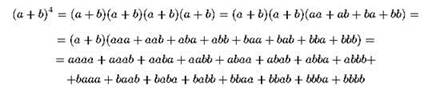 что соответствует значению С24; после приведения подобных членов в итоговом многочлене появится одночлен 6а2b2. В то же время, например, одночлен b4 встретился нам всего один раз (в виде bbbb), что соответствует С44 = 1, и так далее.
