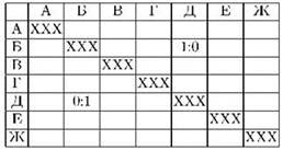 Есть и второй вариант объяснения. Результаты спортивных соревнований по так называемой “круговой системе”, где каждый играет с каждым ровно одну партию, обычно представляют в виде турнирной таблицы, причём для каждого участника турнира предусматривается своя строка и свой столбец. Диагональные клетки таблицы, то есть такие, которые стоят на пересечении строки и столбца, соответствующих одному игроку, заштрихованы, поскольку сам с собой никто играть не собирается. Далее, если, например, игрок Б с игроком Д сыграли партию, и Б выиграл, то считается, что партия закончилась со счётом 1:0 в пользу Б; в его строку на пересечении со столбцом Д заносится результат “1:0”, тогда как в строку Д на пересечении со столбцом Б заносится результат “0:1” (см. рис. 1.10).