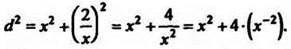 Пусть М(х;у) -точка, лежащая на гиперболе. Найдём расстояние от точки до начала координат: d2 = х2 + у2; т. к. у = 2/x, то
