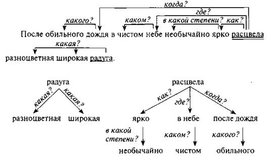— Попробуйте сделать пояснения к второстепенным членам, предварительно составив словосочетания. (После дождя (какого?) обильного, в небе (каком?) чистом, ярко (в какой степени?) необычайно. После обильного дождя в чистом небе необычайно ярко расцвела разноцветная широкая радуга.)